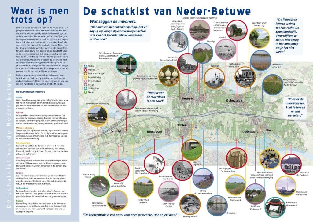 Uitkomst: Inwoners van Gemeente Neder-Betuwe zijn trots op hun cultuurhistorie: een schatkist vol verhalen, tradities en tastbare overblijfselen van het verleden. Ze willen dat erfgoed behouden. Maar moet de gemeente dan op slot? Nee, vinden de inwoners, het verleden biedt juist kansen.